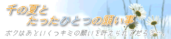 ![]() ボクはあといくつキミの願いを叶えてあげられるだろう……。 心臓病の少女とその隣に住んでいる少年のお話です。 【検索キーワード】高校生 病院 観覧車 ミサンガ HOMEに戻りたい方はコチラから入りなおして下さいませ。 管理者である式部雪花々にあります。 無断転載、転写、複写は一切禁止、お断りしております。 二次創作でのご利用もご遠慮くださいませ。 また、背景等に使用されている素材の著作権は、 全てお借りしている素材サイト様に帰属しております。 こちらも転載禁止です。 |